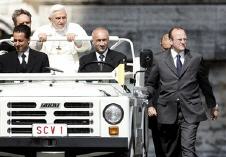 Domenico Giani, 44 ans, est le chef des services de sécurité pontificaux. Il est "à la tête d'un contingent d'officiers du Vatican facilement identifiables à leurs complets sombres, qui protègent l'une des personnalités les plus exposées au monde, à la veille du premier voyage du Pape dans un pays musulman, qui suscite des inquiétudes pour sa sécurité" (Yahoo)