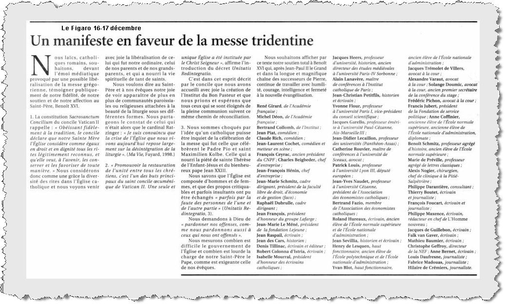 Par René Girard, de l'Académie française ; Michel Déon, de l'Académie française ; Bertrand Collomb, de l'Institut ; Jean Piat, comédien ; Claude Rich, comédien ; Jean-Laurent Cochet, comédien et metteur en scène ; François Ceyrac, ancien président du CNPF ; Charles Beigbeder, chef d'entreprise ; Jean-François Hénin, chef d'entreprise ; Jean-Marie Schmitz, cadre dirigeant, président de la faculté libre de droit, d'économie et de gestion (faco) ; Raphaël Dubrulle, cadre dirigeant ; Jean François, président d'honneur du groupe Lafarge ; Jean-Marie Le Méné, président de la fondation Lejeune ; Jean Raspail, écrivain ; Jean des Cars, historien ; Denis Tillinac, écrivain et éditeur ; Robert Colonna d'Istria, écrivain ; Isabelle Mourral, président d'honneur des écrivains catholiques ; Jacques Heers, professeur d'université, historien, ancien directeur des études médiévales à l'université Paris IV Sorbonne ; Alain Lanavère, maître de conférences à l'Institut catholique de Paris ; Jean-Christian Petitfils, historien et écrivain ; Yvonne Flour, professeur à l'université Paris I, vice-président du conseil scientifique ; Jacques Garello, professeur émérite à l'université Paul-Cézanne, Aix-Marseille III ; Jean-Didier Lecaillon, professeur des universités (Panthéon-Assas) ; Catherine Rouvier, maître de conférences à l'université de Sceaux, avocat ; Patrick Louis, professeur à l'université Lyon III, député européen ; Jean-Yves Naudet, professeur à l'université Cézanne, président de l'Association des économistes catholiques ; Bertrand Fazio, membre de l'Association des économistes catholiques ; Roland Hureaux, écrivain, ancien élève de l'École normale supérieure et de l'École nationale d'administration ; Jean Sevillia, historien et écrivain ; Henry de Lesquen, haut fonctionnaire, ancien élève de l'École polytechnique et de l'École nationale d'administration ; Yvan Blot, haut fonctionnaire, ancien élève de l'École nationale d'administration ; Jacques Trémolet de Villers, avocat à la cour ; Alexandre Varaut, avocat à la cour ; Solange Doumic, avocat à la cour, ancien premier secrétaire de la conférence du stage ; Frédéric Pichon, avocat à la cour ; Francis Jubert, président de la Fondation de service politique ; Anne Coffinier, ancienne élève de l'École normale supérieure, ancienne élève de l'École nationale d'administration, diplomate ; Benoît Schmitz, professeur agrégé d'histoire, ancien élève de l'École normale supérieure ; Marie de Préville, professeur agrégé de lettres classiques ; Alexis Nogier, chirurgien, chef de clinique à la Pitié- Salpêtrière ; Philippe Darantière, consultant ; Thierry Boutet, écrivain et journaliste ; François Foucart, écrivain et journaliste ; Philippe Maxence, écrivain, rédacteur en chef de L'Homme nouveau ; Jacques de Guillebon, écrivain ; Falk van Gaver, écrivain ; Mathieu Baumier, écrivain ; Christophe Geffroy, directeur de la NEF ; Anne Bernet, écrivain ; Louis Daufresne, journaliste ; Fabrice Madouas, journaliste ; Hilaire de Crémiers, journaliste. --------------------------------- Nous laïcs, catholiques romains, souhaitons, devant l'émoi médiatique provoqué par une possible libéralisation de la messe grégorienne, témoigner publiquement de notre fidélité, de notre soutien et de notre affection au Saint-Père, Benoît XVI.