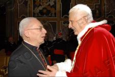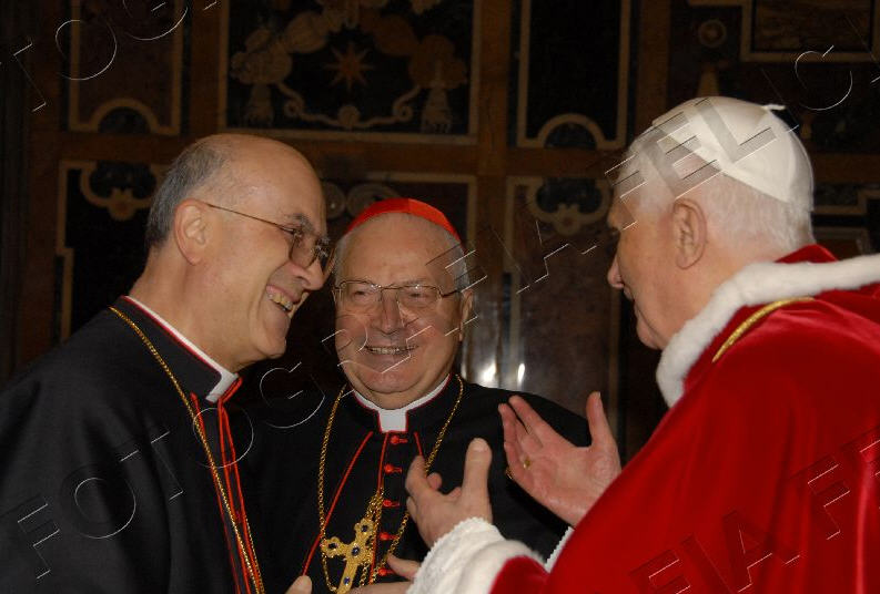 Les cardinaux Bertone, Ruini, Poupard, le commandant de la garde suisse, et des membres de la "famille pontificale"