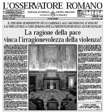 Précisons que certains catholiques, qui décidément ne veulent rien comprendre, n'ont relevé dans ce discours de fin d'année que la phrase relative au "respect pour l'islam".(*) Comme si cette phrase, qui a forcèment un aspect diplomatique, même si, venant de lui, elle ne peut être que sincère, et qui renvoie au "troisième cercle" de sa mission universelle, celui qui concerne les relations avec les autres (voir ici, lors de l'audience du 6 décembre: Le Saint-Père s'explique sur son voyage ), ne s'inscrivait pas de manière évidente dans le souci pastoral d'éviter le choc des civilisations, qu'il redoute plus que tout!