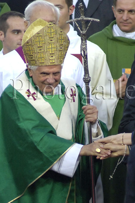 A la fin de la messe, en regagnant la sacristie improvisée, le Saint-Père, souriant et lumineux, est littéralement happé par de nombreux fidèles, qui veulent simplement le toucher, et on le voit à plusieurs reprises sur les images de la RAI, réajuster son anneau torturé par l'enthousiasme des pélerins.