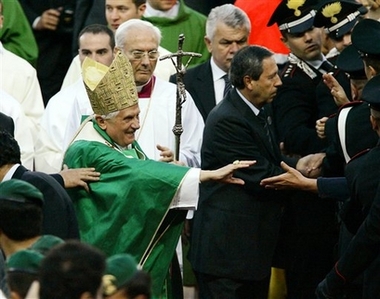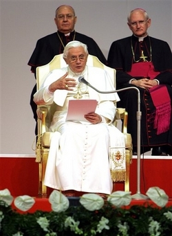 Benoît XVI a appelé les Italiens à demeurer fidèles à leurs traditions chrétiennes, jeudi 19 octobre, à Vérone, lors d'une allocution de plus d'une heure devant le congrès de l'Eglise italienne. Il a souligné "la gravité du risque de se couper des racines chrétiennes de notre civilisation", et s'est réjoui que ce constat soit aujourd'hui partagé, notamment en Italie, par "de nombreux et importants hommes de culture, y compris par ceux qui ne partagent pas notre foi ou ne la pratiquent pas".