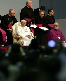 "Etats généraux" de l'Eglise Italienne, à Vérone. Au terme d'un discours de plus d'une heure, interrompu à de multiples reprises par des applaudissements, où il a encouragé d'une certaine façon les catholiques italiens à partir en mission, Benoît XVI reçoit de la part des 2700 délégués présents une splendide "standing ovation" qui dure trois bonnes minutes. Le Saint-Père tente alors de commencer la prière de l'Angelus, et les applaudiisements repartent pour deux minutes de plus