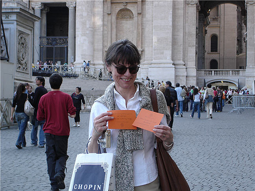 Lundi, 18h: j'ai enfin pu obtenir les billets pour l'audience, à la Préfecture de la Maison Pontificale, au-delà du portail de bronze (pour quelqu'un qui n'est pas très à l'aise pour s'exprimer en italien, ce n'est pas évident...). Un garde suisse a été me les chercher, et je suis folle de joie... Je dois cependant dire que ces billets ne servent à rien, car personne ne me les a demandés pour accéder à l'espace réservé pour les audiences, Place Saint-Pierre.