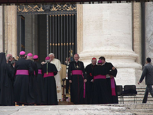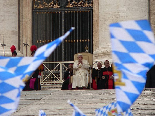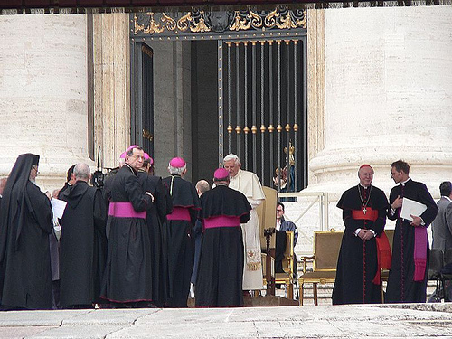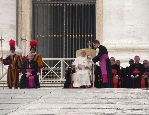 a commencé... Georg Gänswein, trés prévenant, très concentré, lui passe ses feuilles et ses lunettes (il prend tout le temps des notes, ce qui m'incite à penser qu'il répertorie les improvisations du Saint-Père, et les changements par rapport au texte prévu).