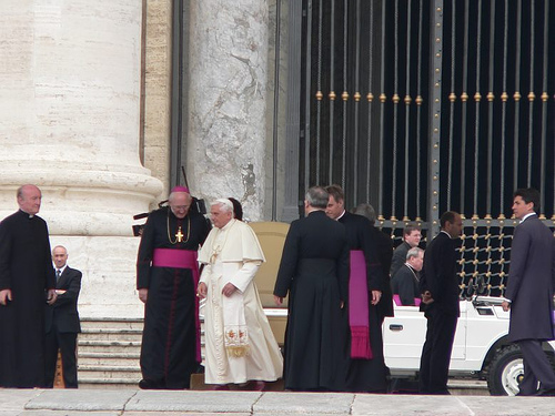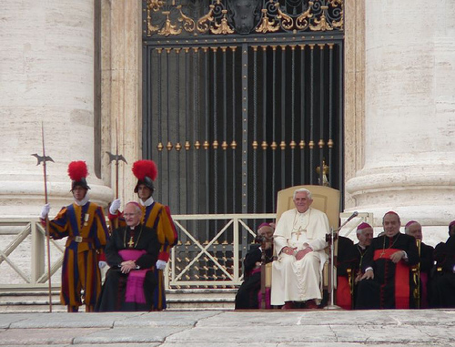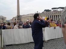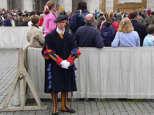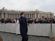 10h25: La pluie vient de cesser, l'attente prend fin (nous sommes arrivées à 7h30!). Le commandant de la Garde Suisse vient s'assurer que tout est en ordre.