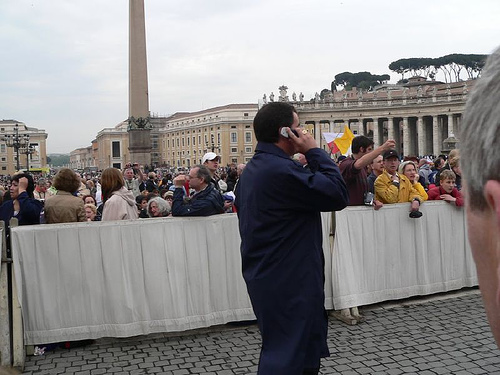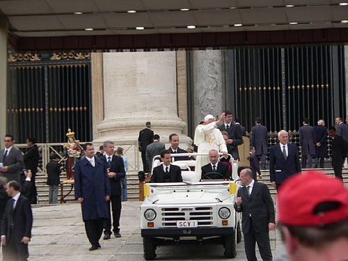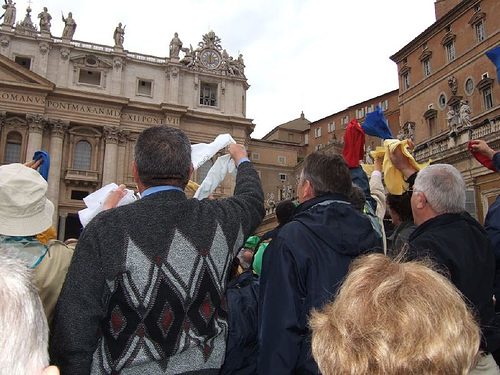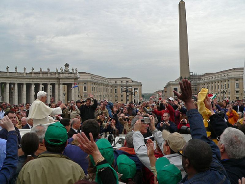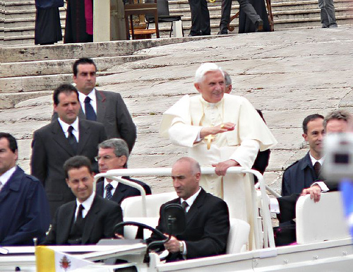 ...laissant sur leur faim les innombrables pélerins grimpés sur leurs chaises et qui scandent son nom, en espérant que la papamobile va passer près d'eux
