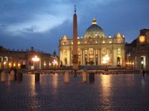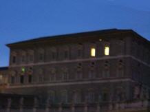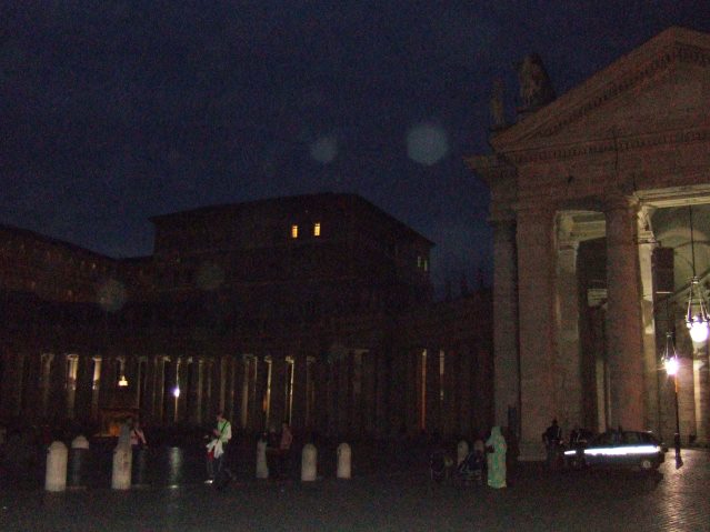 Mardi 25 avril, il est 20h31. Nous venons de manger, au Borgo Pio, et nous retournons sur la place Saint-Pierre, à présent pratiquement déserte après l'affluence de la journée, et déjà plongée dans l'obscurité. De façon inexplicable, la réussite des photos est très inégale, mais je suis contente d'avoir pu fixer dans la mémoire de mon appareil photo SES fenêtres éclairées derrière lesquelles se devine sa présence invisible. Un très bel article d'Olivier Figueras, tiré du journal Présent daté du 22 avril, traduit mieux que je ne l'aurais fait les sentiments d'émotion, de respect presque sacré, que peuvent inspirer ces deux points lumineux chargés de symboles, qui trouent la nuit.