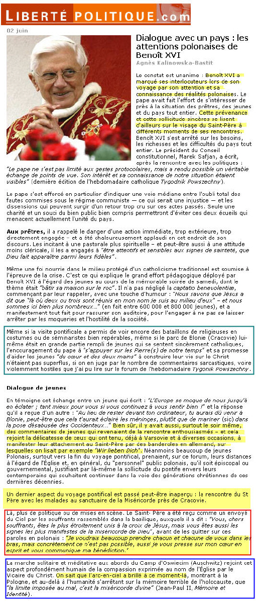 Même si la visite pontificale a permis de voir encore des bataillons de religieuses en costumes ou de séminaristes bien repérables, même si le parc de Blonie (Cracovie) luimême était en grande partie rempli de jeunes qui se sentent sincèrement catholiques, l'encouragement du pape à «s'appuyer sur les Pierre (s) de notre temps" et sa promesse d'aider les jeunes «du coeur et des deux mains" à construire leur vie sur le Christ n'étaient pas superflus, si on en juge par le nombre de commentaires sarcastiques, voire violemment hostiles que j'ai pu lire sur le forum de l'hebdomadaire Tygonik Powszechny. En témoigne cet échange entre un jeune qui écrit : "L'Europe se moque de nous jusqu'à en éclater; tant mieux pour vous si vous continuez à vous sentir bien ?" et la réponse qu'il a reçue d'un autre : «Au lieu de rester devant ton ordinateur, tu aurais dû venir à Slonie, peut-être que cela t'aurait éclairé les méninges, plutôt que de mariner (sic) dans la pose désabusée des Occidentaux..." Bien sûr, il y avait aussi, surtout le soir même, des commentaires de jeunes qui revenaient de la rencontre enthousiasmés - et cela rejoint la délicatesse de ceux qui ont tenu, déjà à Varsovie et à diverses occasions, à manifester leur attachement au Saint-Père par des banderoles en allemand, sur lesquelles on lisait par exemple «Wir lieben Dich". Néanmoins beaucoup de jeunes Polonais, surtout vers la fin du voyage pontifical, prenaient, sur ce forum, leurs distances à l'égard de l'Église et, en général, du "personnel" public polonais, qu'il soit épiscopal ou gouvernemental, justifiant par là-même la sollicitude du pontife envers leurs contemporains qui souhaitent continuer dans la voie des générations chrétiennes de ces dernières décennies.