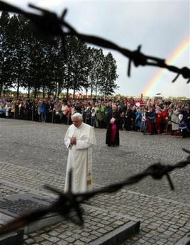 Alors que tu étais sur le point de franchir le seuil de ce lieu de mort, seul au mililieu de tant d'horreurs, et avec les yeux de tout un monde chargé de tant de haine derrière toi, j'étais la proie d'une terrible crainte, je n'avais pas prié ainsi depuis le jour où j'avais prié de toutes mes forces le Seigneur de te choisir comme nouveau Pape, peut-être plus intensément encore, je redoutais tout, puis j'ai regardé ton visage et tes yeux, et j'ai compris ton but, tu es ici le vicaire du Dieu de la raison qui ne fait qu'Un avec l'amour, et à cause de cela, tu as su porter cet amour dans ce lieu d'horreur. Tu n'as pas besoin de l'approbation de la critique et des hommes, l'approbation à tes splendides propos, tu l'avais déjà obtenue avant même de parler, avant même de prononcer ce magnifique discours auquel tu as tant travaillé, auquel tu tenais tant; l'arc-en-ciel qui a accompagné ta visite aux stèles était l'approbation de ce Dieu de la raison et de l'amour qui, de là-haut, souscrivait à chacune des paroles que tu t'apprêtais à prononcer, que la petitesse et la méchanceté humaines ne peuvent comprendre, elles qui critiquent seulement pour le plaisir de critiquer, et de frapper celui que depuis si longtemps, elles ont choisi pour cible...