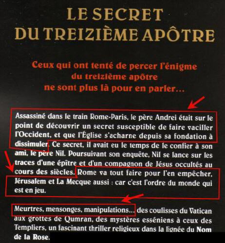 Parmi l'innombrable littérature exploitant sans vergogne la vague commercialement très porteuse de Dan Brown, et son Da Vinci Code, ce pavé américain a fait pour le moment peu de dégât en France, où il été traduit, mais pas encore remarqué, bien qu'on le trouve, bien en évidence, sur les présentoirs des grands distributeurs.