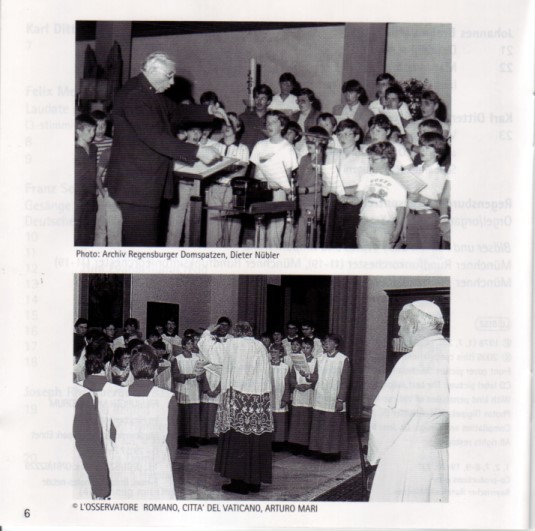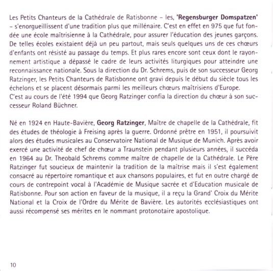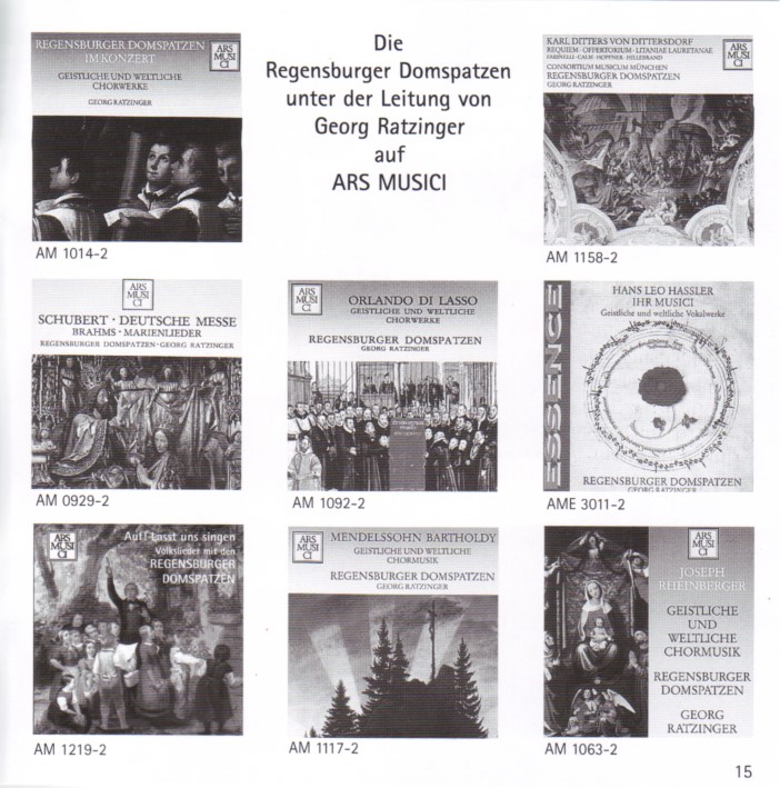 A la librairie du Dom de Regensburg, on trouve une quantité de cd musicaux "signés" par l'ex-maître de choeur des Domspatzen, Georg Ratzinger. Les livrets qui accompagnent ces cd contiennent de nombreuses photos, et même d'intéressantes notices biographiques... On y apprend notamment qu'il a consacré une partie de ses talents musicaux à la chanson populaire, et que "les autorités écclésiastiques ont distingué ses mérites en le nommant protonotaire apostolique".