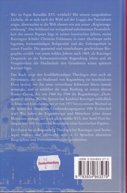 Les librairies que j'ai pu visiter, là-bas, (je dois à la vérité de dire: pas partout, peut-être, mais il ne s'agissait que de petites villes) sont pour un français passionné par ce sujet, comme je le suis, de véritables cavernes d'Ali-Baba... Nous sommes habitués à de maigres rayons "Religions et ésotérisme", où la spiritualité hindoue voisine avec les "témoignages" de prêtres homosexuels ("Rose soutane") et de femmes-évêques (!!), les pensum de Jacques Duquesnes ou Henri Tincq, les "oeuvres" (en fait les alibis) de l'abbé Pierre, ou les divagations de Mgr Gaillot (ce dernier a provisoirement disparu des gondoles, étant passé de mode, et pour l'instant inutile) et les "révélations" sur l'Evangile de Judas, la non-virginité de Marie et les frères de Jésus!! Je n'exagère nullement, je suis passée hier à la Fnac de Strasbourg, et c'est exactement ce que j'y ai vu. Sans compter d'autres ouvrages que l'auto-censure m'interdit de citer ici... J'ai toujours pensé que, si l'on devait illustrer d'une seule image les propos saisissants du cardinal Ratzinger, à la veille du conclave, sur "la dictature du relativisme", il suffirait de faire une photo de ce rayon "Religions" de la Fnac!!! Les librairies allemandes auxquelles je fais allusion ont aussi l'équivalent, malheureusement, mais également bien autre chose... La totalité des oeuvres du cardinal Ratzinger est disponible, évidemment (reconnaissons qu'on peut aussi les trouver chez nous dans leur traduction française, via Internet). Ainsi que de nombreuses biographies. Il n'est d'ailleurs pas inutile de préciser que les livres y sont en général nettement moins chers que chez nous, et que les commandes sont honorées dans les 24 heures!!!